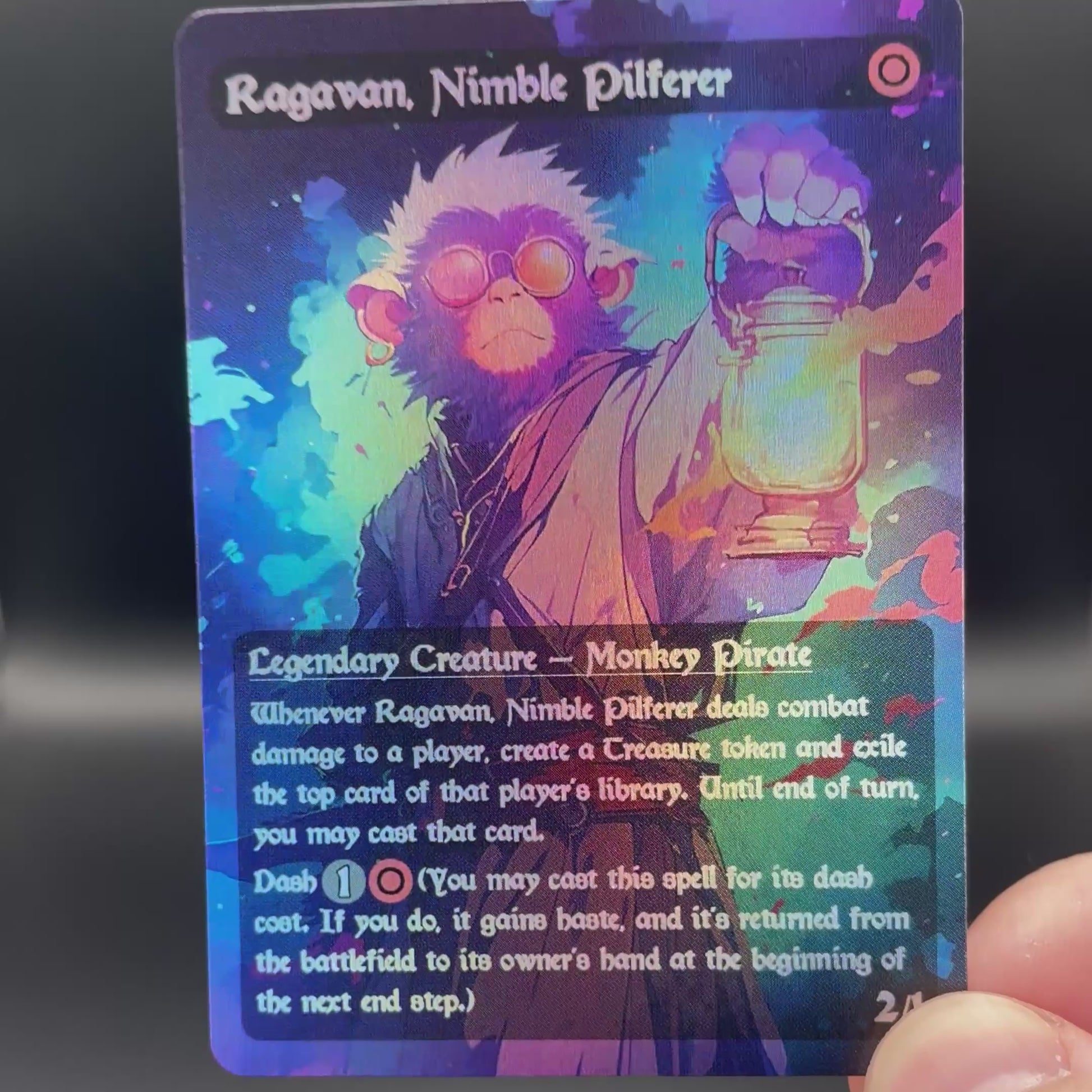 Get your hands on this stunning Ragavan, Nimble Pilferer custom MTG proxy! Crafted with premium S33 black core card stock for durability, these custom cards are perfect for taking your deck to the next level without breaking the bank. Please note, these are unofficial proxy cards, NOT tournament-legal, and intended for playtesting only.