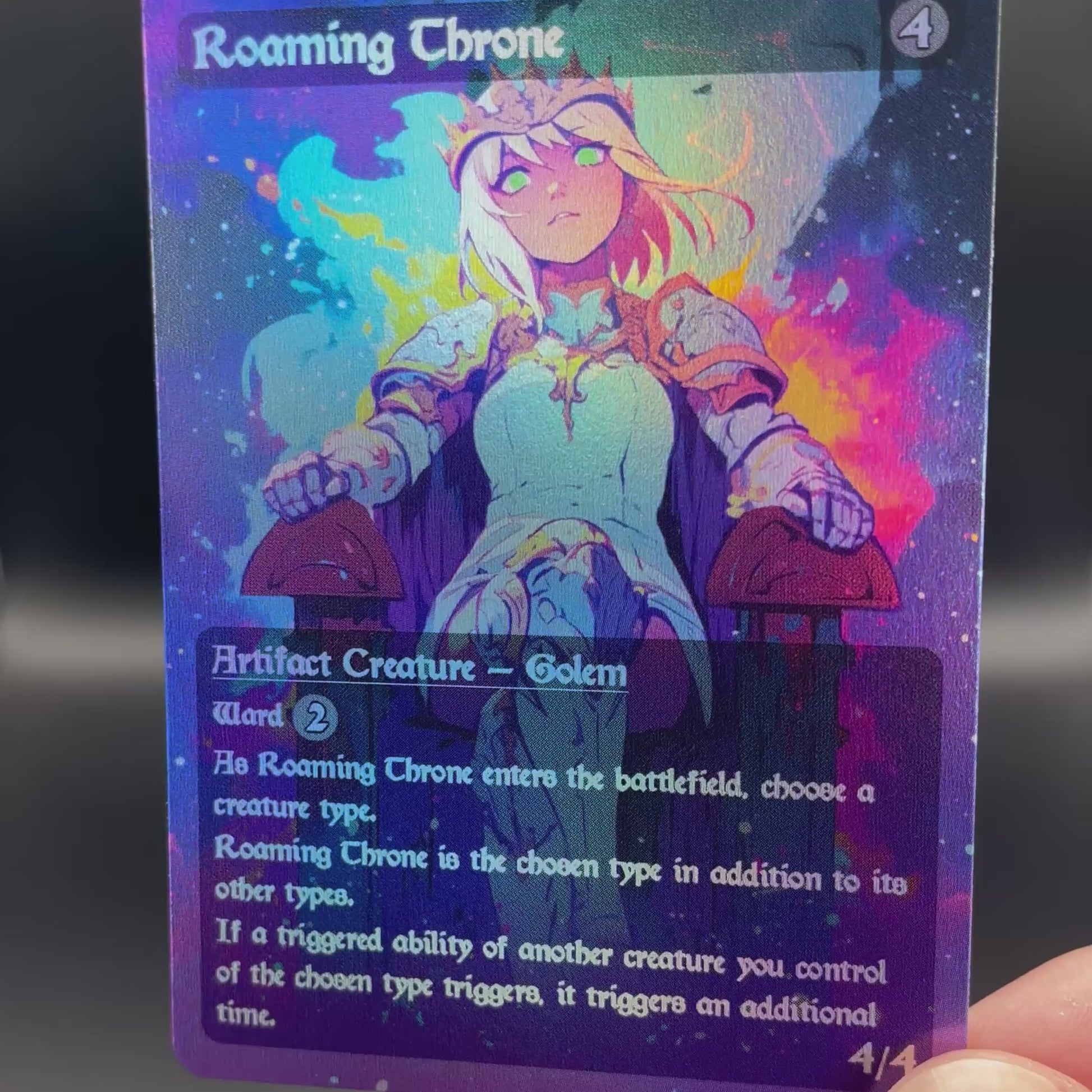Get your hands on this stunning Roaming Throne custom MTG proxy! Crafted with premium S33 black core card stock for durability, these custom cards are perfect for taking your deck to the next level without breaking the bank. Please note, these are unofficial proxy cards, NOT tournament-legal, and intended for playtesting only.