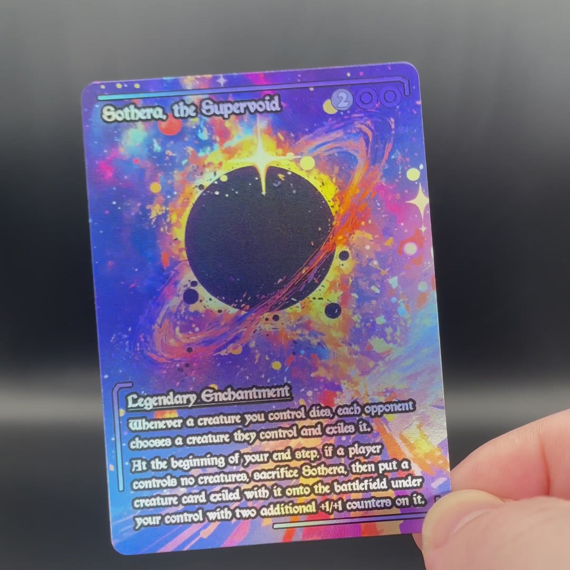 Get your hands on this stunning Sothera, the Supervoid custom MTG proxy! Crafted with premium S33 black core card stock for durability, these custom cards are perfect for taking your deck to the next level without breaking the bank. Please note, these are unofficial proxy cards, NOT tournament-legal, and intended for playtesting only.